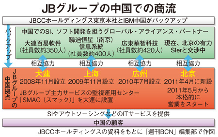 北京オフィスの本格的な立ち上げによって、JBグループの中国における商流づくりの枠組みがほぼ完成する。かねてからJBグループのオフショア開発先として太いパイプをもつ大連地区にデータセンター(DC)を置き、ここを拠点にアウトソーシングや遠隔による監視運用「SMAC」サービスを提供。さらに各地の地場有力SIerと協力関係を築き、SIやソフト開発などマンパワーを必要とするビジネスもこなすスタイルだ。