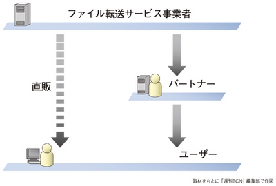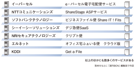 イーパーセルは、受取人まで安全に確実にモノ(情報)を運ぶ「e・パーセル電子宅急便」のサービスを、1996年から米国を皮切りにスタートした。これまでに5400社の企業を獲得している。また2002年には、NTTコミュニケーションズが企業向けオンラインストレージサービスとして「Share Stage ASPサービス」を開始した。近年、ファイル転送サービスの新規サービスも増えており、ソフトバンクテクノロジーは、オンラインストレージ「GIGAPOD」を開発・販売する宮城県のITベンダー、トライポッドワークスと共同開発したファイル転送サービス「ビジネスファイル便 Share IT ! Fits」を昨年6月から展開している。東日本大震災の復興支援として無償で提供し、13社から申し込みがあった。また、シーイーシーソリューションズは、2008年からファイル転送ソフトウェアの「デジ急便」を販売。昨年7月にSaaS版、そして9月にアプライアンス版を開始するなど、幅広いビジネスを展開している。