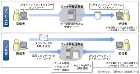 そんななか、法人向けの「ファイル転送サービス」の新しいサービスが増えている。イーパーセルでは「プッシュ型」と「プル型」として配送方法を区分している。イーパーセルが提供している「プッシュ型」は送信者、受信者双方にクライアントソフトをインストールし、クラウド上の配送サーバーを中継して、受信者に送り届ける方式だ。一方の「プル型」とは、ウェブブラウザからクラウド上のサーバーにデータをアップロードして、送信先にメールでダウンロードURLを送る。受信者はURLからデータを持ってくる方式だ。事業者の9割は「プル型」とみられる。