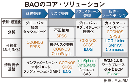 業務プロセスの分析・最適化を図るBAO(ビジネス・アナリティクス・アンド・オプティマイゼーション)の事業拡大に取り組んでいる日本IBM(橋本孝之社長)は、BAOの本格展開を目指して、財務管理やリスク管理など4分野をカバーするBAOのコア・ソリューションを策定した。IBMはこれをもって、グローバル化で膨大化・複雑化しつつあるユーザー企業のデータを整理しようとしている。