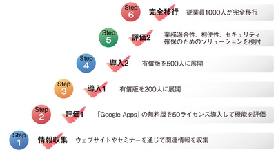 NJCは、今回の移行プロジェクトを推進するため、6段階のステップを踏んだ。メールとグループウェアという全従業員が毎日使うアプリだけに、「新たなインフラに移行すれば、混乱が予想される。だからこそ、細心の注意を払った」(浅野利也・経営企画部IT企画グループシニアエキスパート)。具体的な手順は上図に示した通りだが、50人→200人→500人→全員と段階的に移行を進めていったことがポイント。一度に導入すれば、操作説明やトラブル対応依頼が重なって混乱することが予想されたため、部分導入を積み重ねた。また、「ヘルプデスク」を社内に設置。トラブル対応を専門で行う人員を確保し、混乱を避けた。さらに、グループウェアの移行では、専用ソフトを自社で開発した。従来活用していたグループウェアのデータを「Googleカレンダー」に自動で移すための機能と、旧グループウェアにデータを入力した場合、自動で「Googleカレンダー」にもその情報が反映される機能をもつソフトで、このツールが「(移行に)大きな役割を果たした」(同)。