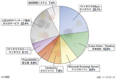調査会社ノークリサーチによると、年商500億円未満のSMB市場の導入社数シェアでトップを走るのはサイボウズの「サイボウズOffice」で、23.1%のシェアを獲得している。2位は日本IBMの「LotusNotes/Domino」(16.6%)、3位は日本マイクロソフトの「Microsoft Exchange Server」(9.6%)、4位はネオジャパンの「desknet's」(7.9%)、5位は富士通の「TeamWARE」(6.8%)と続く。「サイボウズOffice」と「LotusNotes/Domino」「Microsoft Exchange Server」を合わせると、SMB市場で半数弱のシェアを占める。