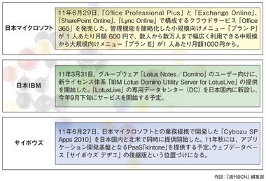 日本マイクロソフトは主な対象だった大企業に加え、SMBへの販売を推進。「Business Productivity Online Suite」の次期バージョンで、「Office Professional Plus」と「Exchange Online」「SharePoint Online」「Lync Online」で構成する「Office 365」を展開している。日本IBMは従業員1000人以下の企業向けエントリー版「Lotus Domino Express」の特別割引キャンペーンを展開中で、モバイルデバイスとソーシャルネットワークの活用を軸とする提案に力を入れている。「LotusLive」には専用データセンターを国内に新設し、今年9月下旬にサービスを開始する予定だ。