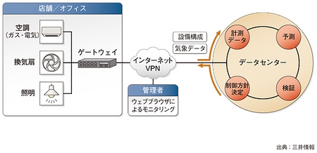 三井情報が2010年2月に提供を開始し、大手家電量販店やシネマコンプレックス運営会社などが導入している「GeM2(ジェムツー)」は、省エネルギーマネジメントを実現するクラウド型サービスである。店舗やオフィスの温度・湿度情報をインターネットを介してデータセンター(DC)に送信し、その情報をもとにして、空調・換気扇・照明を統合的に自動制御するのを特徴としている。「GeM2」は、例えば室内の平均温度を27℃に設定すれば、季節や時間帯に合わせて、温度を下げたり上げたりして、平均として27℃を保つように自動的に調整する。消費エネルギーの削減を行うと同時に、店舗/オフィス環境の快適さを維持することができるわけだ。