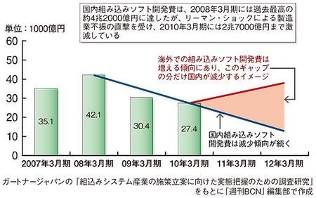 一方、国内をみると、製品の開発工程に特化する組み込みソフトの特性が裏目に出ている。例えば、業務向けの情報サービスでは、仮に開発工程を海外のオフショア開発会社に外注しても、国内でのシステム構築や運用アウトソーシング、次期システムのコンサルティングといったITライフサイクル全般に関わるビジネスの余地が大きい。この点、組み込みソフトは、開発工程が海外に移転すると、とたんに国内でのビジネスが厳しくなる。