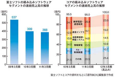 組み込みソフトに強い主要SIerの業績は徐々に回復の兆しをみせている。独立系SIerで組み込みソフト開発に強い富士ソフトとコアは、2008年のリーマン・ショック直後、組み込みソフトの売り上げを大幅に落とした。だが、昨年度(11年3月期)にほぼ下げ止まり、今年度(12年3月期)以降、再び盛り返すとの感触を得ている。Android機をはじめとするスマートフォン・スマートデバイスの開発需要が高まっていることに加え、組み込みソフト関連の自社オリジナルのパッケージ製品の開発に努めていることが背景にある。