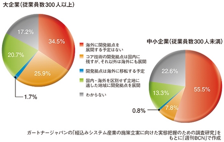 組み込みソフトは、製造業と表裏一体の関係にあるので、本来なら製造業ユーザーとともに地球上のどこへでも行く覚悟が求められる。組み込みソフト開発支援団体のOpen Embedded Software Foundation(OESF)の三浦雅孝代表理事は「開発の現場に張りついてこそ、ユーザーが求める提案が可能になる」と、自らも会員とともに海外へ積極的に出向く。調査会社のガートナージャパンによれば、組み込みソフト開発の海外開発に関して、大手製造業であればあるほど海外移転指向の強さがみられる。大手では「コア技術の開発以外は海外にも出す」と「国内外を問わず最適地に開発拠点を置く」を合計すると46%を超える。