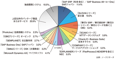 ノークリサーチの調査では、2010年における年商500億円未満のSMBの導入シェアで1位を獲得したのはSAPジャパン「SAP ERP(R3を含む)/SAP Business All-in-One」の11.4%だった。2位は、富士通「GLOVIAシリーズ」の10.0%、3位はオービックビジネスコンサルタント(OBC)「奉行V ERP/奉行新ERP(奉行21シリーズ/奉行iシリーズを除く)」の6.4%、4位はNTTデータシステムズ「SCAWシリーズ」と日本オラクル「Oracle E-Business Suite」の5.9%だった。