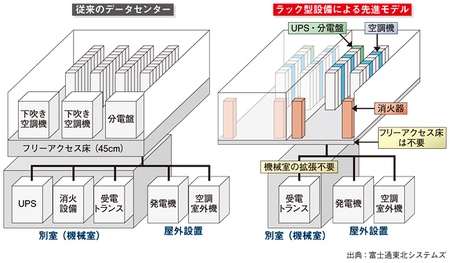 従来型のDCでは、サーバー室の下に、無停電電源装置(UPS)や空調機を置いた機械室を設けている。そのため、機械室につながるケーブルを配線する高さ約45cmの二重床(フリーアクセスフロア)を設置する必要がある。しかし、富士通東北システムズは、青森DCの増床にあたって、建築構造上の問題で床下にフリーアクセスフロアを設置できないという課題を抱えていた。同社のビジネスモデル変革室・江口則地ITエキスパートは、「DC増床の物理インフラのソリューションを探す際に、フリーアクセスフロアを設置せずに済むDC構成を実現できることを重要視した」と語る。