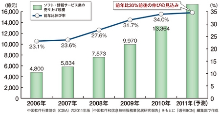 中国のソフトウェア開発・情報サービス業の売上規模は、ここ数年、年30%前後で急成長している。中国ソフトウェア産業協会(CSIA=中国軟件行業協会)の調べによれば、2010年の売上規模は、前年比34.0%増の1兆3364億元(約16兆368億円)と大幅に伸長。2011年上半期についても、北京アウトソーシングサービス企業協会(BASS=北京服務外包企業協会)は「ほぼ前年同期並みの成長」と、高い伸びで推移するとみている。
