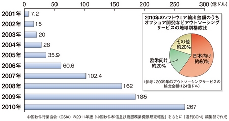 中国のソフトウェア・情報サービス業で注目すべきは、力強く伸びる輸出である。CSIAの集計によれば、2010年の輸出額は、前年比44.3%増の267億ドル(2兆559億円)で全体の10%余りの構成比を占める。この金額には、通信機器や電子機器の輸出に関連するソフトウェアが含まれていることから、純粋な情報サービス業の輸出額とは一致しない。参考値として、2009年の中国でのオフショアソフト開発をはじめとするアウトソーシングサービスの輸出額は24億ドル(1848億円)である。このアウトソーシングサービスの輸出先を地域別にみると、日本がトップで約60%を占め、次いで欧米が約20%の構成比を占めている。しかし、日本から中国へのオフショアソフト開発の発注額がリーマン・ショック以降大きく落ち込み、さらに日本国内の経済停滞や雇用維持のための内製化傾向が依然として強いことから、中国では欧米からの受注拡大に取り組む動きもみられる。