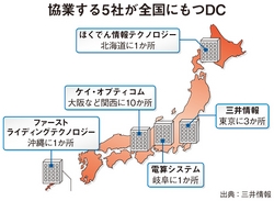 三井情報がDC事業でアライアンス体制を構築したのは、ほくでん情報テクノロジーのほか、岐阜県の電算システム、大阪府のケイ・オプティコム、沖縄県のファーストライディングテクノロジーの4社だ。三井情報を含む5社は、北海道から沖縄まで、全国各地で合計16か所のDCを運営している(図参照)。提携による第一弾として、8月中旬に、各社DCをDRサイトとしたハウジングやリモートバックアップといった共同サービスの提供を開始した。