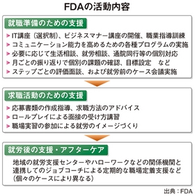 FDAは、障がい者や在宅勤務者、ひきこもり、ニート、ホームレス、うつ病患者、シニア、ワーキングプアなどの人たちの就労を目的に、就職準備に必要な教育や求職活動の支援、就労後の支援・アフターケアを行うことで、雇用機会を増やす活動をしている。厚生労働省によれば、うつ病やひきこもりなどで悩みを抱えている人たちは全国に約270万人いるという。同省の研究によれば、15人に1人の割合で、一生に一度は罹る可能性があるそうだ。