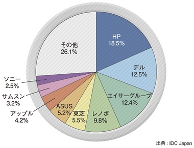 2010年の全世界でのパソコン出荷台数は、約3億4700万台に上る。このマーケットで優勢なメーカーをみると、米国の2社を追いかけるアジアメーカー2社という構図が浮かび上がる。2010年のメーカー別シェアでトップに立つのは米HPで、シェアは18.5%。2位は12.5%の米デル。1位と2位とは6ポイントの差があり、HPが一歩抜きん出ているのがわかる。その後ろをアジア勢のエイサーグループ(12.4%)とレノボ(9.8%)が追っている。3位のエイサーグループは、デルに0.1ポイント差にまで迫っている。