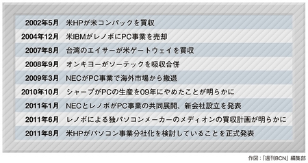 パソコンメーカーは、この10年の間に大きな決断を下してきた。その経緯をみると、市場からの撤退や事業の譲渡、自主生産の打ち切りなど、パソコン事業の厳しさを感じさせる経営判断が目立つ。2002年5月、当時世界市場で2位の米コンパックが4位の米ヒューレット・パッカード(HP)に買収されたのを皮切りに、国産、外資系を問わず、複数の有力パソコンメーカーが姿を消してきた。