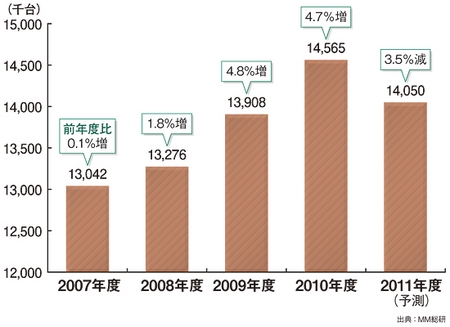調査会社のMM総研のデータを活用して、国内パソコン市場の出荷台数を年度別でみた過去4年の実績と、今年度(2011年4月~12年3月期)の見込みを示したのが右図である(個人向けを含む)。実績をみると、07年度~10年度まで伸び率に多少の違いはあるものの、一貫して前年度を超え、10年度には過去最多の出荷台数となる1456万5000台に到達。MM総研によれば、最多の出荷台数を10年ぶりに更新したことになる。10年度の実績を個人と法人で分けると、個人向けが前年度比6.8%増の737万台、法人向けが同2.6%増の719万5000台で、ともに伸びた。