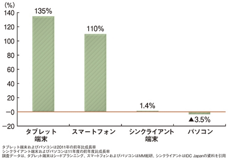 クライアント端末の今後を考えれば、パソコンだけが選択肢とは考えにくい。ネットワークの高速化と仮想デスクトップ技術の普及は、シンクライアント端末を本格的に普及させる原動力になるだろう。クラウドを活用してデータを端末に保存しない方法を求めるユーザー企業が増加する傾向にあり、そうなるとクラウドと相性がいいシンクライアント端末が従来以上に伸びる可能性がある。