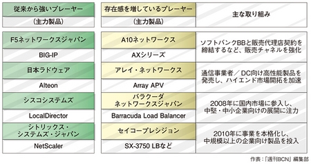 ロードバランサ市場の活性化につれて、メーカーの勢力図が変わりつつある。ここ数年の間に、市場の有望性に着目して日本市場での事業展開を開始する外資系メーカーが相次ぎ、現在は彼らのビジネスが本格化する時期を迎えている。大企業に強く、2010年のメーカー別シェア(IDC Japan調べ)で40%超を獲得しているのはF5ネットワークスジャパンだ。同社は、引き続き市場をリードしているが、事業拡大中のA10ネットワークスやアレイ・ネットワークスなど、ハイエンド市場に強みを発揮するプレーヤーが増えてきている。また、中堅・中小企業(SMB)向けの市場でもメーカー間の競争が激しくなっている。2008年、バラクーダネットワークスジャパンがSMBをターゲットに据えて参入し、セイコープレシジョンなどと競争するようになった。セイコープレシジョンはSMB市場での競争の激化を受け、昨年、中規模以上の企業向け製品を投入するなど、新市場の開拓に取り組んでいる。