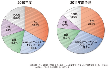 これまでのロードバランサ市場は、1位の座にあるF5ネットワークスジャパンをはじめ、日本ラドウェアやシスコシステムズ、シトリックス・システムズ・ジャパンなど、上位メーカーのポジションにはそれほど大きな変動がなかった。ところが、2009年から急速に事業を伸ばし、順位を上げつつあるメーカーが現れている。次世代サーバロードバランサの「AXシリーズ」を展開しているA10ネットワークスがそれだ。最近、IDC Japanや富士キメラ総研、ITRなど、複数のIT調査会社が、A10ネットワークスの継続的なシェア拡大を予測している。富士キメラ総研は、2010年度のロードバランサ市場で「AXシリーズ」が20%のシェアを獲得し、2011年には29.2%までに拡大すると見込んでいる。A10ネットワークスは今年7月にソフトバンクBBと販売代理店契約を締結し、販売チャネルの拡大・強化を急ぐ。さらに8月にはオフィスを移してスペースを増大するなど、積極的に事業拡大を推進している。一方、このほど社長が交代したF5ネットワークスジャパンは、A10ネットワークスの動きをみて、SMBや製造業といった新市場を開拓することに力を入れている。ロードバランサは今後、メーカー間競争が激しくなり、市場構成が活発に変動する時代に入るとみられる。