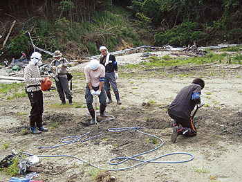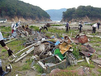 鮫浦地区に到着したのはお昼前。気温は30℃を超えている。全滅状態の集落には、家や樹木など日陰となるものは一つもない。まるで、灰色の砂で覆われた砂漠のような風景だ。メンバーは、ほぼ20人構成のグループに分かれて、各グループリーダーの下でゴミの収拾や瓦礫の片づけといった作業に着手する。仮設道路の脇には、数台の大型バスが並んでいる。鮫浦地区には、大塚商会以外にも企業や個人のボランティアグループが来ており、日よけの帽子をかぶって軍手をはめた数百人のボランティアが復興活動に励んでいる。