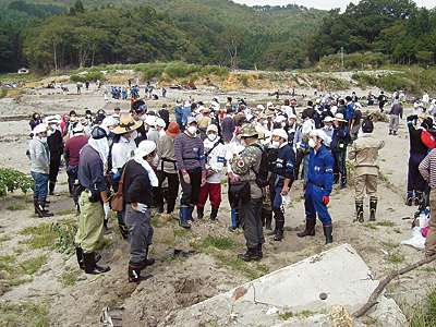 9月10日(土曜日)の朝、大塚商会の約130人のメンバーが、ボランティアセンターとして利用されている石巻市牡鹿公民館に集合した。センターのスタッフから説明を受けて、活動にあたっての注意事項が説明される。牡鹿半島はいまだに強い余震が続いており、再び津波が発生する危険性が高い。メンバーは、万が一に備えて、グループを組んで慎重に動き、リーダーの指示に従わなければならないと、スタッフは念を押す。牡鹿公民館は、津波によって1階が浸水した。天井の内装が落ちて、今もカビの臭いが漂っている。