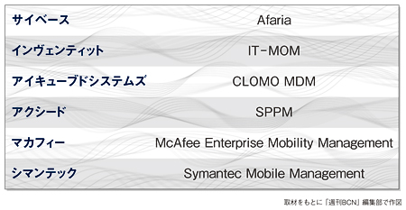 国内市場には、昨年から本格的にMDM製品が登場し始めた。製品化の立ち上げが早かったのは、アクシードだ。2007年に「Smart Phone Policy Manager(SPPM)」という名称でWindows Mobile向けの管理製品の提供を開始。現在はAndroid対応ソリューションも展開している。10年11月には、アイキューブドシステムズのMDMで、iOS、Androidに対応した「CLOMO MDM」がスタート。また、インヴェンティットは「ITーMOM」という製品を販売。昨年は大手ISPのサービスのエンジンとしても活用されていた。各キャリアの法人向けサービスの一つとしてOEM供給している。また、外資ベンダーでは、モバイルDBを販売するサイベースが今年2月から世界No.1シェアの「SyBase Afaria」を展開。これはiOS、Androidに対応している。セキュリティベンダーのマカフィーも、今年3月から、マルチプラットフォームに対応した「McAfee Enterprise Mobility Management」を販売している。