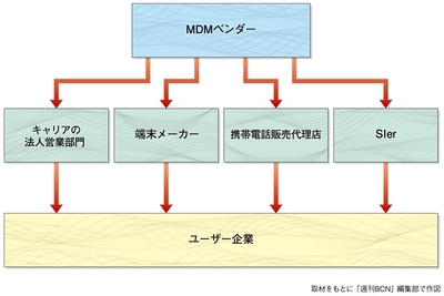 「携帯電話販売代理店」もしくは「キャリアの法人営業部門」、エンジンを利用して独自のサービスを提供する「サービスプロバイダ」、そのほか「端末メーカーの法人営業部門」もMDMの販売に興味を示している。MDM単体の販売も行われているが、サービスプロバイダへのOEM供給や、連携ソリューションの事例も出てきている。