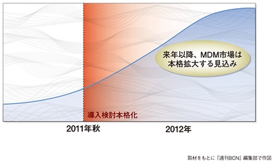 今秋から来年にかけて、企業のスマートデバイス導入が本格化すると見込まれている。それにつれて、MDMの本格的な商機がやってきそうだ。キャリアの法人営業部門、大手携帯販売代理店を介した販売や、SIer、サービスプロバイダを介して、独自ソリューションを組み合わせて販売するなどのさまざまな売り方がある。