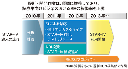 共同利用型サービスの「STAR-IV」は、これまで準大手・中堅の証券会社が主なユーザーだったが、証券業界最大手の野村證券が加入することで、業界のデファクトスタンダードの地位を手にできる見込みだ。現行の「STAR-IV」では、野村證券の巨大システムの要件は満たせないため、延べ3万人月を動員し、2011年から2012年にかけての約1年半の間に不足要件を補う開発を行う。野村證券へのサービス開始時期は2013年初めを予定している。