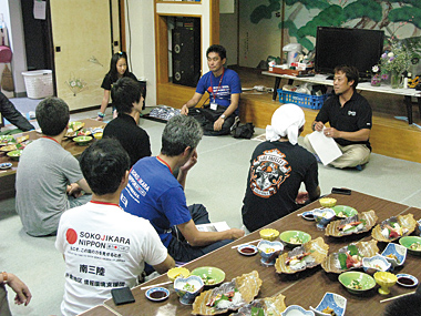 一行はパソコンなどの設置を終えたあと、奇跡的に津波の被害が最小限ですみ、短期間に営業を再開できた海辺の民宿「ながしず荘」に宿泊した。ここでは、当時、町の社会福祉協議会で老人クラブを担当していた佐々木真さんが、町内の高野会館でカラオケ大会を開いていたときに津波に遭った話を披露した。このとき、佐々木さんのとっさの判断で、300人以上の参加者を施設の屋上に避難させ、命を救ったという経緯を聞いた。「大きな地震が起きたら、すぐ逃げるという鉄則を再認識した」と、振り返った。