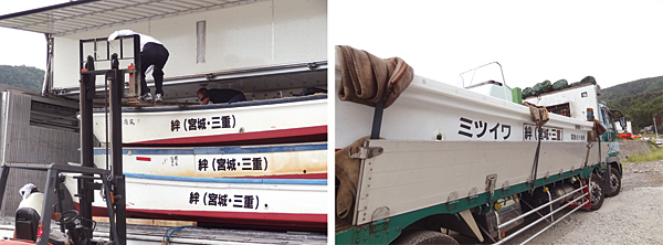 トラックで運ばれてきた電動船と漁船