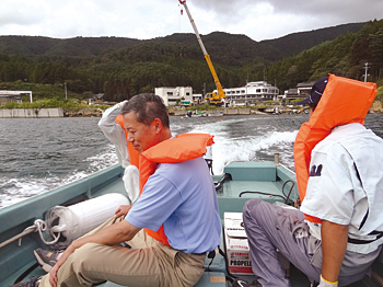 現地までの所要時間はおよそ2時間。北上川沿いを雄勝に向けて走っていくと、突然、崩落した橋や廃屋、瓦礫の山が姿を現した。東日本大震災から半年、撤去作業は徐々に進められているとはいえ、ここで何が起きたかを示すには十分なほどの悲惨な光景が広がっている。雄勝町に着くと、公民館の屋上に乗っかったままの大型バスが目に飛び込んできた。雄勝湾付近は津波で建物が流され、土台だけを残っている家が多かった。雄勝漁港の桟橋も海に沈んで消失同然だったが、その傍らの波打ち際にカキの稚貝が吊るされていた。