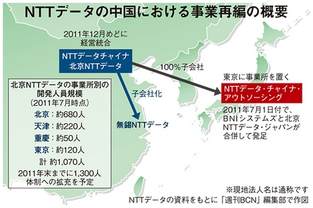 NTTデータは中国で2000人規模のスタッフを展開しているが、うち北京NTTデータの2011年7月時点のスタッフ数は約1070人と最大規模を占める。内訳は北京が約680人、天津が約220人、重慶が約50人、そしてブリッジSEなどを中心に東京で約120人のスタッフを抱える。中国での新入社員は秋入社が一般的なので、年末までには昨年同期比で300人余増のおよそ1300人の体制に拡充する見込みだ。新統合会社のNTTデータチャイナは、データセンター(DC)を活用したアウトソーシングサービスを強みとする無錫NTTデータと、日本向けのオフショア営業会社2社が今年7月に統合したNTTデータ・チャイナ・アウトソーシングを直属の傘下に収める。日本側のオフショア営業窓口を一本化し、新生NTTデータチャイナの直轄に再編することでオーバーヘッドロスを減らす。