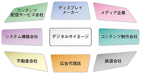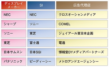 デジタルサイネージでコンテンツを発信する仕組みには、さまざまな企業が関わっている。まず、交通・観光情報や広告などのコンテンツを制作・配信するためのメディア企業と広告代理店、コンテンツ制作会社の存在がある。そして、それを発信するために必要な情報機器のメーカーと、システムを構築するためのITベンダーが関わる。そのうえで、ディスプレイモニタを設置する場所をもつ公共機関や交通機関、建物を管理する不動産事業者も絡む。IT業界で大きく関わるのが、コンテンツを表示するための映像表示機器をつくるメーカーと、コンテンツを配信するためのネットワークとシステムを構築するSIerだ。最近は、コンテンツの配信を請け負うアウトソーシング事業者も出てきた。映像表示機器メーカーは、デジタルサイネージに大きなビジネスポテンシャルを感じている。公共・交通機関向けの大型映像表示機器に強いNECは、09年の段階でデジタルサイネージに特化した専門部隊を70人体制で組織し、ここ数年、本腰を入れている。