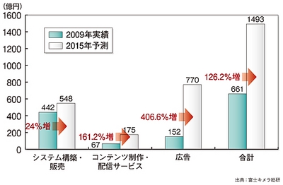 消費者の間では、まだデジタルサイネージはそれほど知られていないが、中期的にみれば関連する製品・サービスのビジネスボリュームは増えそうだ。図は、富士キメラ総研が調査した2009年の市場規模と15年の予測を示したもの。市場全体は、09年の実績が661億円だったのに対し、15年には1493億円になる見込みで、約2.26倍に急成長する予想だ。マーケットを細分化してみると、関連する機器やシステムの販売・構築サービスのマーケットは、15年には09年比べて24%伸び、548億円規模になる。それ以上に伸びるのが、コンテンツ制作・配信の関連分野と、広告だ。コンテンツ制作・配信に関する15年の市場は、09年に比べて約2.6倍。広告は、デジタルサイネージ機器を設置する企業や公共機関、広告代理店が広告出稿主から得る金額で、15年の市場規模は09年に比べて、約5倍。金額は770億円になる見込みで、デジタルサイネージ市場の約半分を占めることになるとみられる。広告のビジネスを細分化すると、交通機関向けと、「インストアメディア」が670億円と大半を占めることになりそうだ。小売り・流通業または交通機関向けの情報システムソリューション事業を展開する企業にとっては、デジタルサイネージは今後の有力商材になるとみていいだろう。