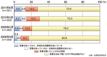 調査会社の矢野経済研究所が、2011年6月に東京在住の消費者を対象としたデジタルサイネージの知名度に関する調査を行った。IT業界や広告業界では有望視している分野だが、消費者の認知度はまだ低い。「言葉も知っており、具体的な設置例も知っている」と回答した比率は8.8%にとどまる。逆に「言葉を初めて聞いたので何も知識がない」という回答は72.6%にも及ぶ。昨年と比較すると、「知らない」の回答率は2.3ポイント増えている。首都圏でこの数値であれば、地方ではもっと認知されていないだろう。消費者が知っているデジタルサイネージとして最も知られているのが、山手線の車内に設置されている「トレインチャンネル」で、その次が東京メトロの車内にある「Tokyo Metro ビジョン」。電車内のデジタルサイネージの知名度が圧倒的に高く、コンビニエンスストアや小売店、駅、ビルの壁などに設置されている「インストアメディア」は、ほとんど気づかれていないことがわかった。