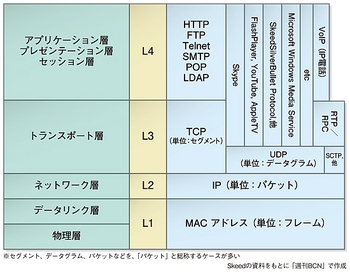 技術的な側面からみると、Extreme File Transferと呼ばれる超高速ファイル転送技術は、UDP(User Datagram Protocol)上に開発されているケースが多くを占める。UDPは、ウェブ閲覧やファイル転送用に使われているHTTPやFTPよりも下のレイヤーに位置し、IP(Internet Protocol)レイヤー上に実装される(下図参照)。IPを活用することで、世界中に行き届いているインターネット回線を使えるとともに、Skeedの「SkeedSilverBullet」や富士通の「BI.DAN-GUN(ビーアイドットダンガン)」のように高速ファイル転送に最適化した独自のプロトコルを開発して機能を拡張することもできる。