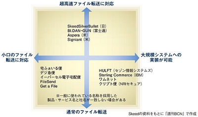 ファイル転送は、大別して二つの軸で捉えられていた。「宅ふぁいる便」のように個人でも使える小口のファイル転送サービスと、企業の大規模な業務システムに組み込むかたちで使う「HULFT」のようなアプリケーションだ。しかし、ここにきて超高速で大容量のファイルを転送できる“Extreme File Transfer”に対するニーズが高まっている。古くからあるファイル転送プロトコル“FTP(File Transfer Protocol)”に比べて、例えばSkeedの「SkeedSilverBullet」の場合、最大で30倍の転送速度を誇る。転送速度の速さが求められるようになった要因としては、企業活動のグローバル化やBCP、DRのニーズ拡大が挙げられる。国際回線はどうしても通信ネットワーク帯域が限られ、BCP、DRも遠隔地へ大量のデータ転送を必要とする。広い帯域を確保しようとすれば、それだけ通信事業者へ支払うコストが増えるので、限られた帯域を最大限有効に使うプロトコル技術の開発が活発化している。
