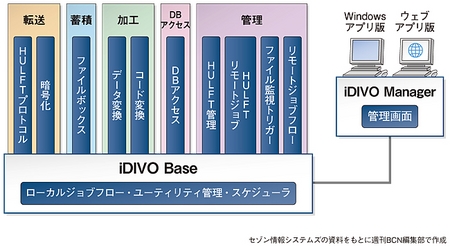 ユーザー企業の業務と密接に関わるファイル転送ツールだけに、売り方はユーザー先にある既存の業務システムといかに親和性を高めるかを重視する傾向が強い。セゾン情報システムズは2011年8月、ジョブフロー管理を実装した「iDIVO(アイディーボ)」を投入。従来のHULFTプロトコルだけでなく、データの変換や蓄積、ジョブフロー管理といったファイル転送に関わる機能をブロック単位で組み合わせて使えるスイート製品だ。HULFTプロトコル単体でも従来通り販売するものの、顧客の周辺ニーズを幅広く採り入れることでトップシェアのポジションをより揺るぎないものにすることが狙って発売した。