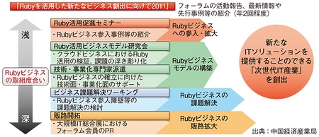 一方、昨年8月には「ちゅうごく地域Rubyビジネスフォーラム」を設立し、まつもとひろゆき氏が開発した「Ruby」を島根県以外の中国各県に波及させる事業を進めている。Rubyの技術をITベンダーに浸透させる一方で、今年度はRubyを活用した新ビジネスの創出やビジネスモデルの研究、事業化に向けたサポート体制などの具体化を開始した。