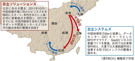 日立システムズは、11年6月に中国地場有力SIerの広東華智科技と組んでDCをベースとしたBPO(ビジネスプロセスアウトソーシング)を開始したのに続き、2012年11月をめどに同じく地場有力SIerの大連創盛科技と合弁で大型DCを大連に開設する予定だ。DC運営を強みとする日立システムズは、このノウハウを広東華智や大連創盛に提供し、広州や大連をBPOやクラウド/SaaSの中国における一大拠点にしていく。