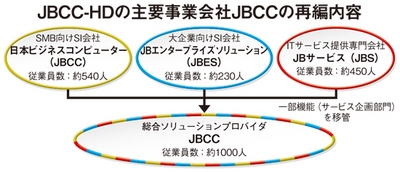 再編の大きなポイントは二つある。一つは、大手企業向けビジネスを手がけるSI会社であるJBエンタープライズソリューション(JBES)と、SMB向けSI会社である日本ビジネスコンピューター(JBCC)の経営統合。もう一つが、ユーザー企業の情報システムの運用代行サービスを企画・提供するJBサービス(JBS)から企画部門を切り離し、JBESとJBCCの統合会社に移管することだ。つまり、対象顧客と、業務の内容で分けた事業会社を統合する、というわけだ。