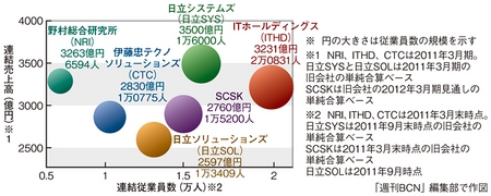 SIer二番手グループのなかに再編の気運が高まっている。情報サービス業ではトップのNTTデータが独走し、その後を「年商3000億円クラブ」と呼ばれる二番手グループが追う。だが、日立システムズとSCSKが2011年10月に3000億円クラブ入りを果たしたことで、同グループはSIer系だけで6社、東芝ソリューションや日本ユニシスなどを入れればさらに増える。この“ダンゴ状態”から頭一つ抜け出し、トップのNTTデータをどこまで追い込めるかが今後の再編の焦点となりそうだ。(安藤章司)
