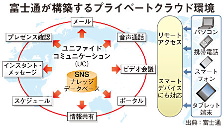 スケジュール・プレゼンス(在籍情報)管理や電子メール、ウェブ会議、情報共有基盤といったコミュニケーションに関連する複数のシステムを、プライベートクラウドで構築する。操作する端末はマルチで、パソコンや携帯電話、スマートフォン、タブレット端末に対応する。システムは、富士通製品ほか、グローバル協業する米マイクロソフトと米シスコシステムズの製品を活用して構築する。
