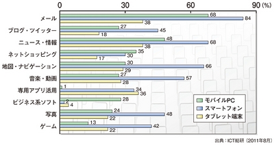 ユーザーは、多様化するモバイルデバイスをどのように使い分けているのか。右図は、主要なアプリケーションソフトとネットサービスの利用頻度を、「モバイルパソコン」「スマートフォン」「タブレット端末」の区分で調べた結果だ。調査は私用/ビジネス用を問わず、約4000人を対象にアンケートを行っている。タブレット端末では、「メール」「ニュースなどの情報閲覧」「タブレット端末の操作と表示画面に最適化した専用アプリ」の利用頻度が高い。だが、モバイルパソコンやスマートフォンに比べて、各項目ともタブレット端末の利用頻度は低い。また、タブレット端末で「ビジネス系ソフトを利用している」と回答したのは、わずか4%。仕事で使う端末としては、まだまだ定着しているとは言い難い。スマートフォンでもビジネス系ソフトの利用頻度は低く、たった2%だ。調査を行ったICT総研は、「タブレット端末の画面に適した専用アプリの充実が不可欠」と、法人での導入に必要な要素を解説している。