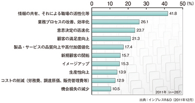 限定的な利用にとどまっているものの、ビジネスでの利用は着実に進んでいる。導入状況をみると、タブレット端末を導入している企業は、2010年は6.6%だったのに対して、11年は2.9ポイント上昇して9.5%になった。10社に1社はタブレット端末を導入している勘定になる。また、「トライアル(試験的)導入している」と答えた企業は8.0%で、この数字を合わせると2011年は17.5%に達した。企業にたずねた導入効果上位10項目が右図だ。最も多い項目は、「情報の共有、それによる職場の活性化」で41.8%、以下、「業務プロセスの改善、効率化」「意思決定の迅速化」と続いた。この3項目のほか、各項目をみてみると、タブレット端末というよりも、モバイル端末を活用することによる情報の収集と発信を迅速に行うことができたことによって効果を得ている。つまり、「タブレット端末だから得た効果」ではない印象を受ける。