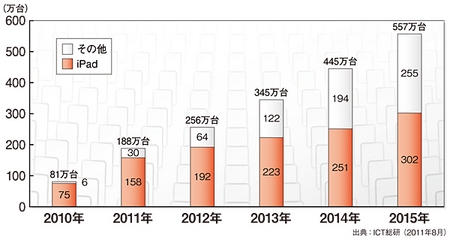 タブレット端末が脚光を浴び始めたのは、アップルが「iPad」を発売した2010年。「iPad」は爆発的にヒットし、この年の国内タブレット端末の出荷台数は81万台に達した。このうち、「iPad」が占める比率は92.6%で、独占状態を形成した。他のコンピュータメーカーの追随が始まったのは2011年。主要パソコンメーカーは、グーグルのAndroidとマイクロソフトのWindowsを搭載したタブレット端末を商品化した。選択肢が増えたことで、さらにコンシューマと法人の注目を浴び、11年の出荷台数は、前年の2倍強の188万台に達した模様だ。これらの調査を行ったIT調査会社のICT総研は、中期的にみても高い成長ぶりを示すと予測している。12年の出荷台数は、前年に比べて約36.2%増の256万台で、3年後の15年には、その2倍にあたる557万台に達するとしている。15年の時点でも「iPad」が占める割合は全体の50%以上で、アップルが市場をけん引する構図に変わりはないとみている。