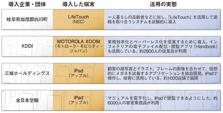 企業のタブレット端末の導入事例からは、さまざまな用途を拾い出すことができる。著名な企業の最近の導入事例を右に示した。説明が必要な商品を販売する小売店舗では、これまで紙の資料やパソコンで行っていた顧客への説明を、タブレット端末に置き換える動きが「iPad」の発売当時から盛んだったが、そうした状況は今も継続している。また、パソコンに比べて操作が簡単な点に着眼した自治体が、高齢者などのITに慣れ親しんでいない住民向けのサービスとしてタブレット端末を活用する動きも出てきた。加えて、一般的なオフィスワーカーが、業務の効率化やペーパーレス化を図るためにタブレット端末を導入するケースも多い。業種・企業規模を問わず、用途は多様化してきた。一方で、公表されている事例の数をみると「iPad」が多い。出荷台数に比例しているともいえるが、「iPad」のマーケティングを積極的に推進しているソフトバンクモバイルの存在も大きい。ソフトバンクモバイルは、販売に結びつけるために「積極的に事例を収集し、公開している」(中山五輪男・シニアエヴァンジェリスト)という。専用サイトを設け、従業員数別・目的別・業種別で事例を検索・閲覧できるようにしており、同社の力がタブレット端末の普及に大きな影響を及ぼしているといえる。