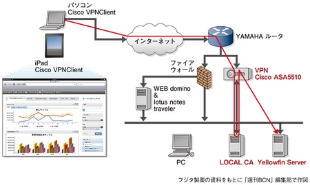 フジタ製薬は2000年にBIソフトの「Cognos」をすでに導入していたが、システムの規模が大きく複雑で、全社で気軽に使えるツールではなかったという。折しも同社では、外での活動が多い営業担当者を主な対象としてiPadを導入。2011年夏のことだった。顧客向けのプレゼンテーションや社内の情報共有に使うことを目的としており、「BI情報もiPadで閲覧できないか」と探したところ、スマートデバイスへの対応を積極的に推進している「Yellowfin」にたどり着いた。