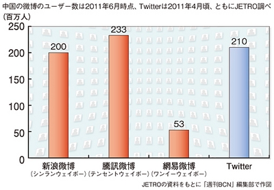 例えば、ユーザー数を大きく増やしているソーシャルサービスのミニブログ(微博)をみると、中国でメジャーなのは新浪微博(シンランウェイボー)や、「QQ」と呼ばれるサービスで有名な騰訊微博(テンセントウェイボー)など。日本貿易振興機構(JETRO)の調べによれば、新浪のユーザー数は約2億人、騰訊は2億3000万人を超えている。中国の調査会社であるiResearchの調査結果をJETROで分析したところ、中国のミニブログのユーザー数は、2011年時点で約2.8億人、2014年には4億3000万人に達するとの予測される。